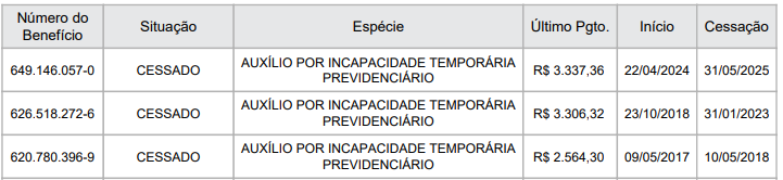 No caso concreto, a parte autora recebeu os seguintes benefícios por incapacidade (e. ):