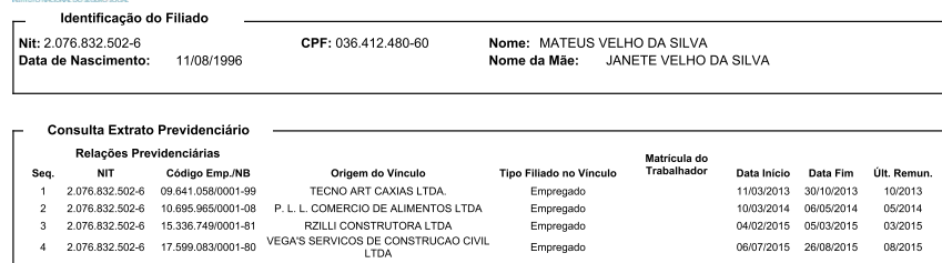 A fim de comprovar o desemprego do instituidor, foi realizada prova oral em 01-08-2024, na qual foi ouvida a testemunha Leandro, que afirmou que, em 2015 e em 2016, chegou a trabalhar junto com o instituidor, fazendo bicos em obras da construção civil, como pedreiro e auxiliar; que não eram registrados em CTPS; que trabalhavam por dia e apenas quando surgia algum trabalho; que Matheus estava procurando emprego com registro, mas não conseguia; que, no pátio da obra, quando realizavam os bicos, procuravam se informar sobre quais empresas estavam contratando; que, depois de um certo tempo (final de 2016 ou 2017), a testemunha conseguiu um emprego fixo e indicou uma vaga na mesma empresa para Matheus, o qual, todavia, não foi aceito porque estava usando tornozeleira eletrônica, em virtude de já ter sido preso e liberado.