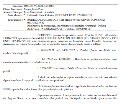 Relativamente à prova de recolhimento à prisão, na declaração da Segunda Vara Criminal de Araranguá do evento 1, PROCADM7, p. 10, consta que Rodrigo Marlon dos Reis foi recolhido em 08/06/2021 em regime semiaberto.