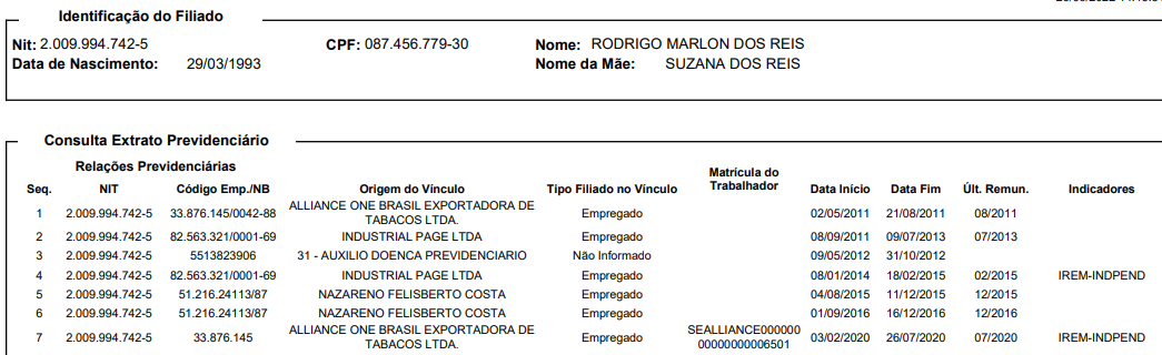 Conforme evento 1, PROCADM7, p. 16, o recluso Rodrigo Marlon dos Reis foi segurado da previdência social desde 05/2011 até 12/2016, voltando a contribuir ao sistema em 02/2020.