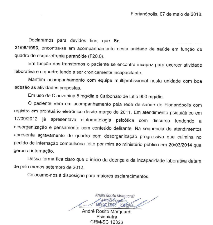 Após análise do quadro, prontuário médico, exame do estado mental e exame psiquiátrico, concluo que embora o autor apresente o diagnóstico de ESQUIZOFRENIA PARANÓIDE e esteja incapaz para o labor, não apresenta sintomas graves o suficiente para necessitar do auxílio de terceiros, mora sozinho, cognitivo preservado, sem internações há 10 anos, apresenta prontuário médico sem menção de gravidade recente, bem adaptado ao tratamento proposto.
