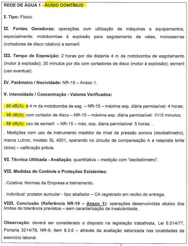 - ruído: código 1.1.6 do Decreto n. 53.831/64 (até 05/03/1997, limite de 80 decibéis); código 2.0.1 do Decreto 2.172/97 (limite de 90 decibéis entre 06/03/1997 a 18/11/2003); Decreto n. 4882/03 (limite de 85 decibéis a partir de 18/11/2003).