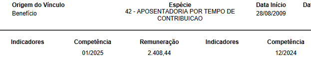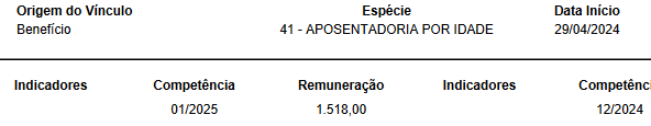 De fato, a autora é atualmente aposentada por idade desde 29/04/2024, com rendimentos em valor de salário mínimo (NB 41/208.779.705-0):
