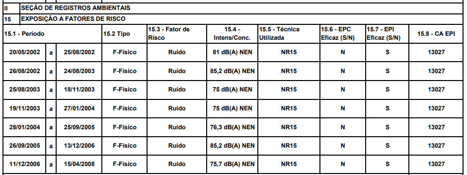 O LTCAT individual apresentado confirma as informações do PPP e informa que foi observada a metodologia NHO-01 – Fudancentro e NR – 15 do MTE para a medição do ruído.