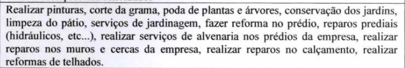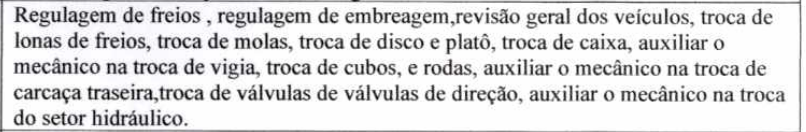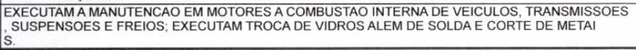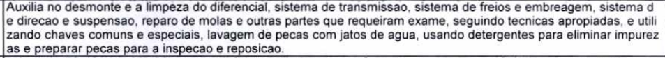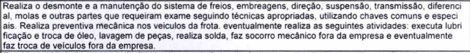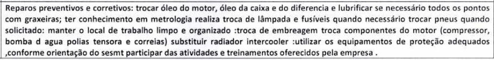 | Cargo/Setor/atividades | 06/04/1995 a 31/10/1996 - serviços gerais A / manutenção/![]() 01/11/1996 a 30/11/1997 - auxiliar de mecânico / manutenção