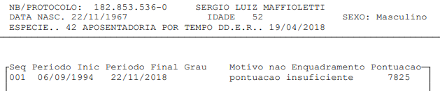 | Até a DER (19/04/2018) | 30 anos, 5 meses e 3 dias | 359 | 50 anos, 4 meses e 27 dias |