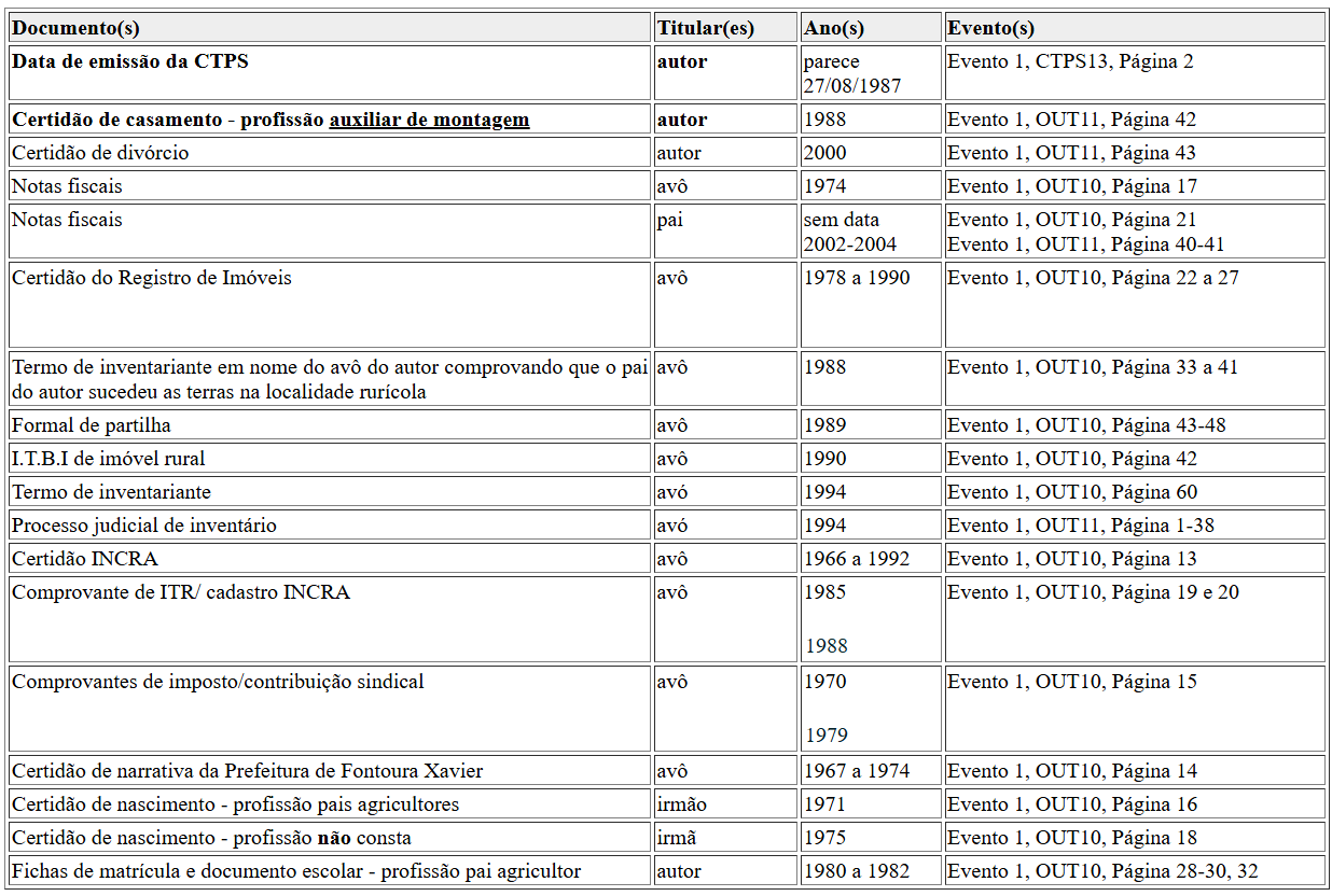 A sentença arrolou os documentos apresentados pelo autor com o intuito de comprovar a alegação de que laborou no meio rural em regime de economia familiar desde tenra idade. Confira-se a tabela elaborada pelo julgador: