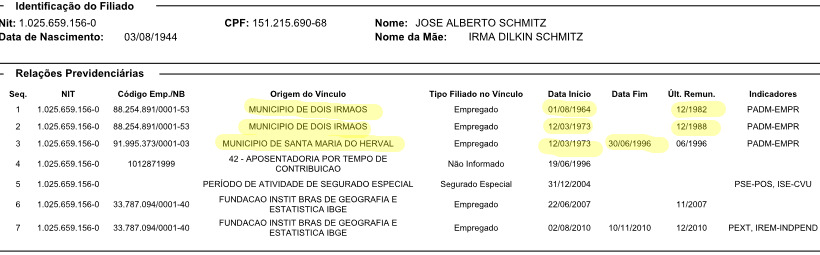Conforme pontuado pelo juízo a quo, verifica-se a existência de vínculo empregatício do genitor desde 1964 até 1996 junto ao Município de Dois Irmãos e Muncípio de Santa Maria do Herval, concomitante ao período rural pleiteado, seguido de aposentadoria por tempo de contribuição.