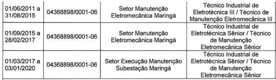 Quanto ao agente nocivo “eletricidade”, entendo que a exposição do trabalhador a níveis superiores a 250 volts, de forma habitual, é suficiente para caracterizar a especialidade da atividade, inclusive para períodos de trabalho posteriores a 05/03/1997 (termo inicial de vigência do Decreto 2.172/97). Nesse sentido: TRU da 4ª Região, IUJEF 200772510047532/SC. Em relação ao tempo de exposição ao referido agente nocivo, adoto como razões de decidir o voto proferido nos autos 200870950021170: “(...) tratando-se de eletricidade acima de 250 volts (atividade periculosa), não se exige que a exposição perdure por toda a jornada de trabalho, pois se trata de risco potencial à integridade física do segurado (...)” (2ª Turma Recursal do Paraná). Nos termos do PPP, estando exposto o trabalhador a tensão superior a 250 volts, é devida a conversão do período, uma vez que esteve exposto a tensão superior a 250 volts, conforme previsto no código 1.1.8 do Decreto 53.831/64. Ressalto que, conforme entendimento firmado pelo STJ (Tema 998), "o Segurado que exerce atividades em condições especiais, quando em gozo de auxílio-doença, seja acidentário ou previdenciário, faz jus ao cômputo desse mesmo período como tempo de serviço especial". Assim, é devido também o reconhecimento, como especial, do(s) período(s) de 22/10/2013 a 11/12/2013, em que recebeu benefício de auxílio por incapacidade temporária. ✅Faz jus ao reconhecimento da especialidade no(s) período(s) de 01/12/1995 a 13/09/2019. |