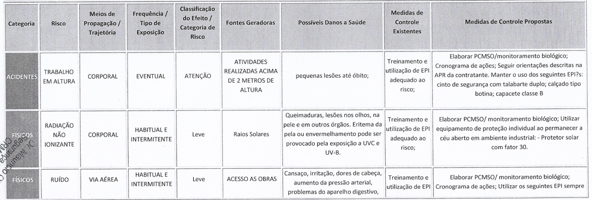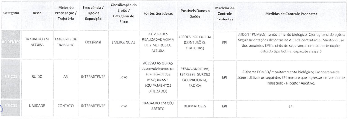 O PPRA de 2019 arrolou os seguintes agentes nocivos ():