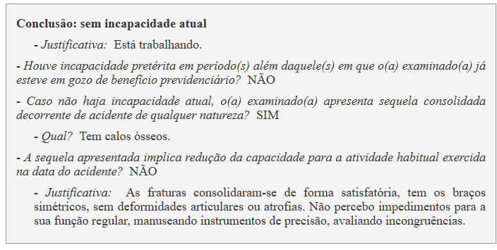A perícia judicial concluiu que inexiste redução da capacidade laboral para a atividade laboral do autor, resultante da consolidação das lesões sofridas em acidente de qualquer natureza do qual o requerente foi vítima.