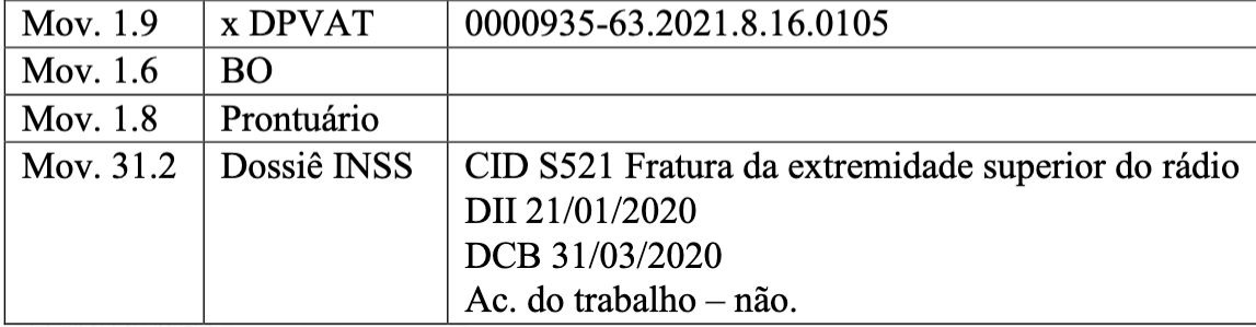Contudo, em razão do acidente sofrido, o promovente ingressou com demanda judicial, visando o recebimento do prêmio do seguro DPVAT, oportunidade em que fora submetido à perícia médica judicial.Assim, conforme confirmado pelo perito, laudo pericial anexo, o promovente teve uma redução de 6,25% da mobilidade do membro superior esquerdo.Em razão do fatídico acidente, o promovente teve que socorrer-se à autarquia previdenciária, qual lhe concedeu o benefício de auxílio doença previdenciário, NB 631.367.335-6, cujo qual perdurou de 05/02/2020 a 31/03/2020.Porém, após a autarquia lhe conceder a devida alta, não lhe concederam o auxílio acidentário, mesmo ciente que do referido acidente teria causado diminuição de sua capacidade laborativa.Não obstante, veja que na demanda securitária, visando receber o pagamento do seguro DPVAT, restou confirmado de que as sequelas resultantes do acidente de trabalho, resultaram em diminuição da capacidade de trabalho de forma permanente.