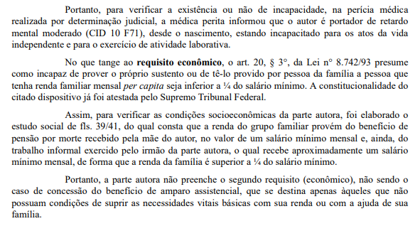 O Apelante, C. D. J. S., é um homem adulto (58 anos) que apresenta grave deficiência intelectual (CID F781), sendo analfabeto, incapaz para o trabalho e totalmente dependente de cuidados de terceiros, exercidos por sua mãe, que também é idosa (76 anos).