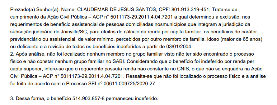 Ocorre que, posteriormente, o Autor protocolou novo requerimento administrativo sob a forma de Revisão Extraordinária (16/10/2020), motivado pela Ação Civil Pública (ACP) n° 5011173-29.2011.4.04.7201. Este novo requerimento foi indeferido pelo INSS em 2024, em uma decisão administrativa que a própria parte autora descreve como eivada de "absurdos", por não ter localizado o processo físico anterior e presumir renda não comprovada, conforme evidenciado da comunicação efetuada pela Autarquia (e. ):