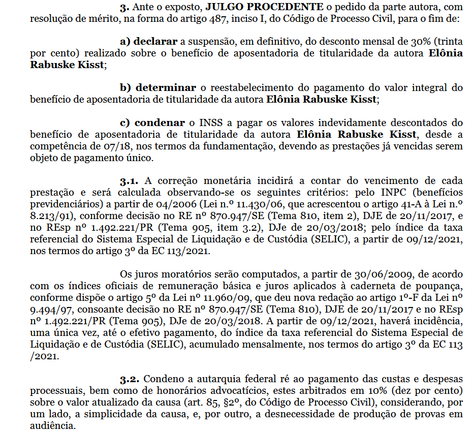 | Observações | Suspender descontos, restabelecimento do valor integral do benefício da autora e a restituição dos valores já descontados |