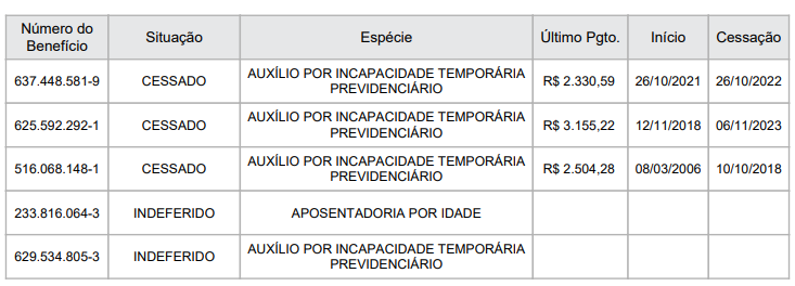 Conforme se extrai de seu Dossiê Previdenciário, a autora esteve em gozo de benefício entre 08/03/2006 e 10/10/2018 (NB 516.068.148-1), e posteriormente entre 12/11/2018 e 06/11/2023 (NB 625.592.292-1). Há registro ainda de um terceiro benefício por incapacidade temporária, em período concomitante a este último (26/10/2021 26/10/2022 - NB 637.448.581-9) []: