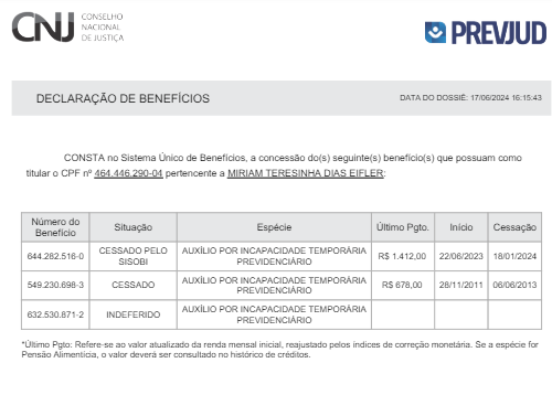 Recebeu benefícios por incapacidade temporária conforme imagem obtida da consulta integrada do CNJ, que colaciono: