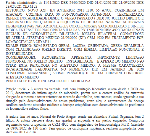 No caso, considerando-se o conjunto probatório e as condições pessoias da autora, que conta com 59 anos, cozinheira, acometida de diversas moléstias incapacitantes (lombalgia crônica com sinais de agudização, coxoartrose e gonartrose, cardiopatia isquêmica crônica, obesidade, deambula com ajuda de bengala, sofreu infarto agudo do miocárdio, realizou angioplastia com stent em 2011 e 2016) que, em conjunto, agravaram o seu quadro clínico desde longa data, 11/2011, sem melhora ao tratamento, patologias crônicas, com reagudizações, faz jus ao benefício de por incapacidade temporária no período compreendido entre a DER (24/09/2020) e o início do benefício por incapacidade temporária seguinte (NB 644.282.516-0, 21/06/2023).