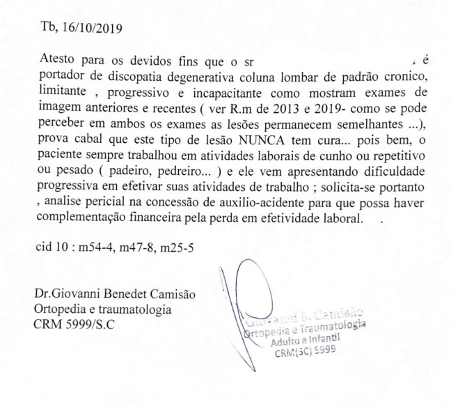 A parte autora (agricultor e 44 anos de idade) objetiva a concessão de benefício por incapacidade desde 16-10-2019 (DER) até 12-11-2021 (data do óbito), decorrente de Lombalgia (CID M4.4), comprovada pela seguinte documentação clínica: