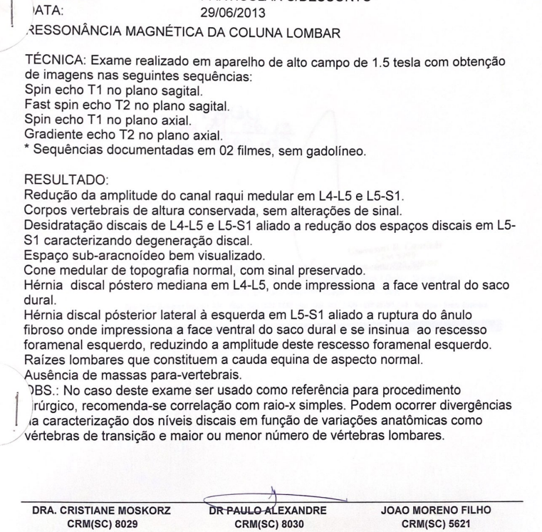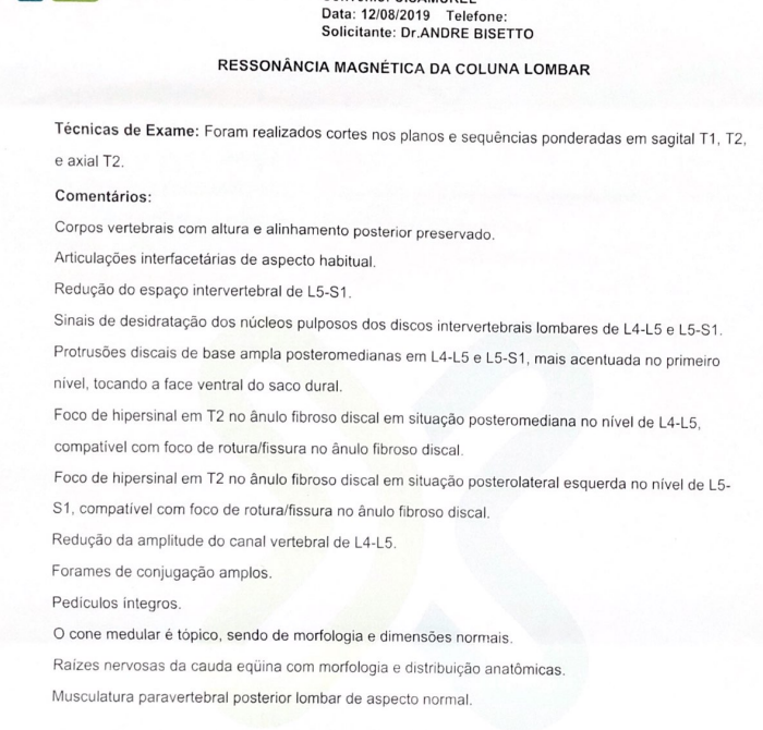 O periciando possuía dor lombar. O início dos sintomas ocorreu em 2013. Que na época não foi submetido a tratamento cirúrgico ortopédico. Realizou tratamento médico conservador. Que não ficou afastado do trabalho por essa lesão.