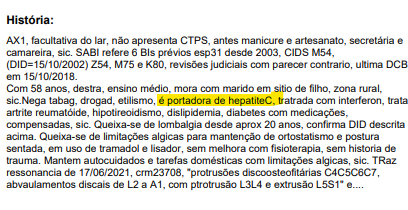 Observa-se que no laudo administrativo (ev. 2 desta AC, fl. 47) referente ao pedido de concessão de benefício NB 6362261317, além dos problemas ortopédicos, foi referido que a autora é portadora de hepatite viral crônica tipo C (CID B18.2), conforme excerto que reproduzo abaixo: