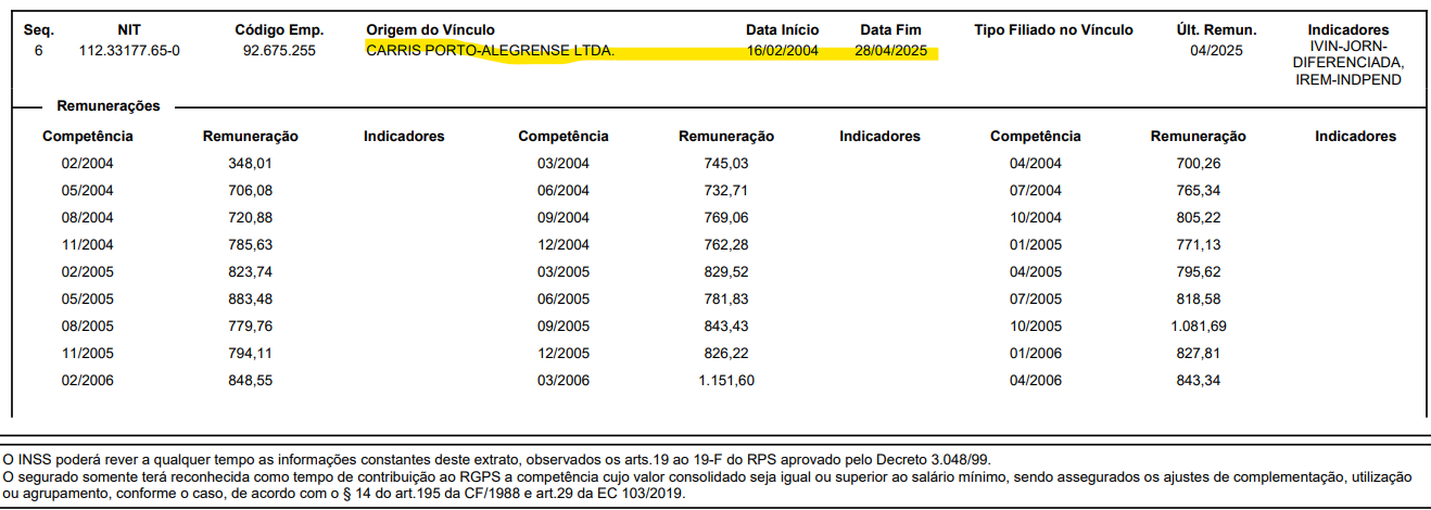 Verifica-se, no extrato acima, que o vínculo empregatício da demandante junto à empresa Carris Porto-Alegrense Ltda., iniciado em 16/02/2004, findou apenas em 26/04/2025.