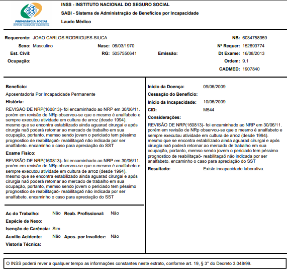 Observa-se, ademais, que a aposentadoria foi concedida na via administrativa, em exame pericial realizado na data de 16/08/2013, sendo possível inferir da leitura daquele laudo que o autor foi encaminhado ao NRP (Núcleo de Reabilitação Profissional no INSS) em 30/06/2011, onde foi constatado que era iletrado e sempre executou atividade em cultura de arroz (desde 1994). Restou ali apontado que embora estabilizado, ainda aguardava cirurgia e que "após a cirurgia não poderá retornar ao mercado de trabalho em sua ocupação" e que "mesmo jovem tem péssimo prognóstico de reabilitação - reabilitação não indicada por ser analfabeto", a saber ():