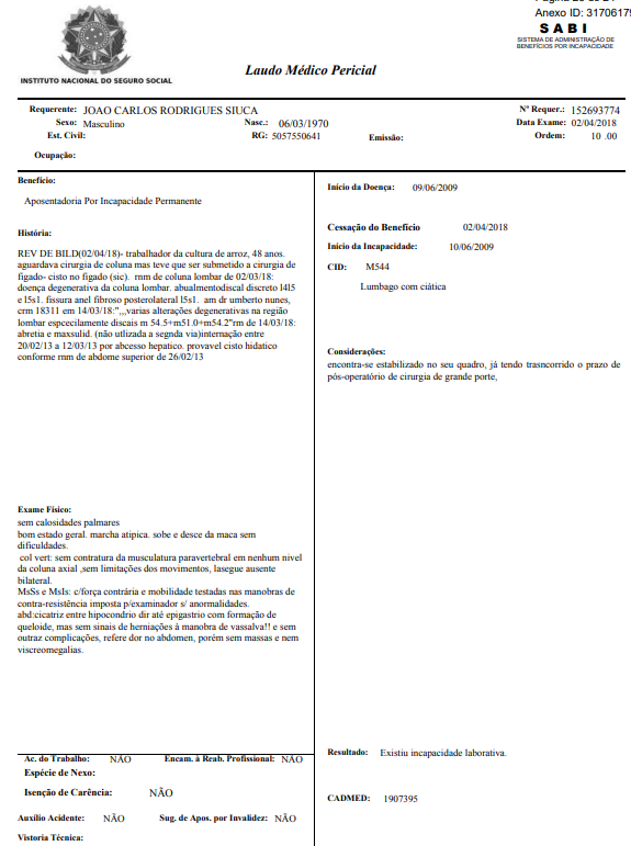 Da análise dos autos verifica-se que o autor recebeu o benefício de auxílio-doença, no período de 25/06/2009 a 15/08/2013, e de aposentadoria por invalidez, no período de 16/08/2013 a 02/10/2019 (), em virtude da moléstia de CID M54.4 - Lumbago com ciática ( - p. 08/23).