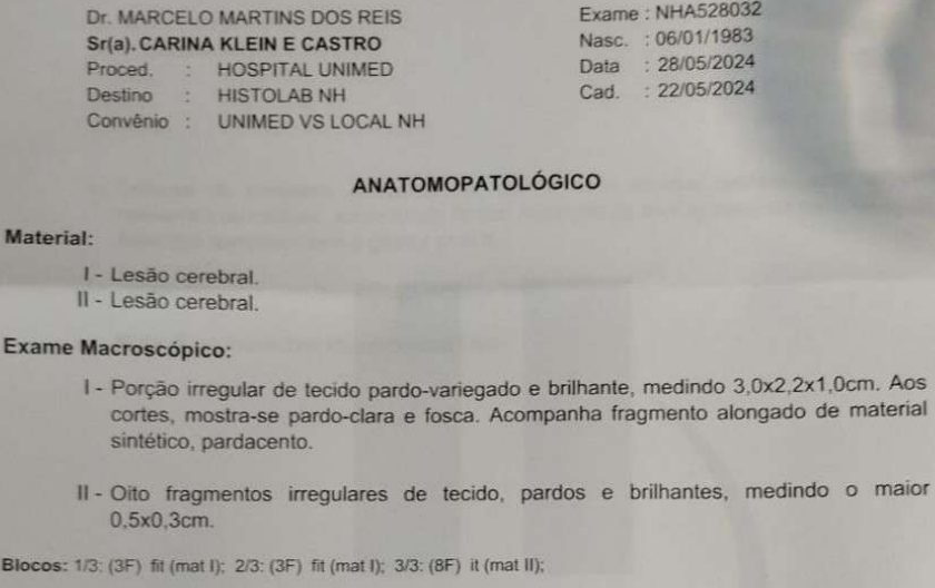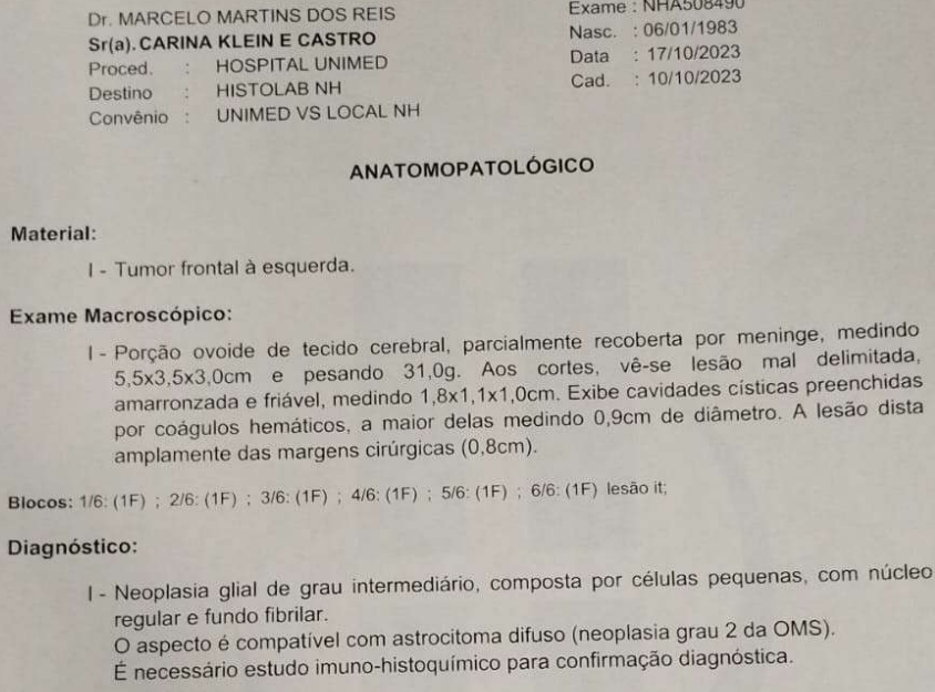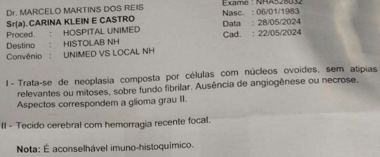 Não pode trabalhar porque seu raciocínio está lento.A autora relatou que tem tumor cerebral e é câncer, a cirurgia foi no Hospital da UNIMED.A autora foi submetida aos seguintes procedimentos:a) 1ª cirurgia neurológica em 09.10.2023 (não foi ressecção total)b) 2ª cirurgia neurológica em 22.05.2024c) está em radioterapia em São Leopoldo (22 sessões das 27 sessões programadas).Faz uso dos seguintes medicamentos:- levatiracetam (antconvulsivante)- escitalopram (antidepressivo)Não usa metodo anticoncepcional.Não teve Covid19. Está vacinada.Destra.Não é fumante.Nega consumo atual de bebida de álcool.Sabe dirigir. CNH B emitida em 13.07.2020.Compareceu com o marido.Mora em Novo Hamburgo com o marido e o filho (12 anos).Recebeu benefício do INSS até 03.2024.