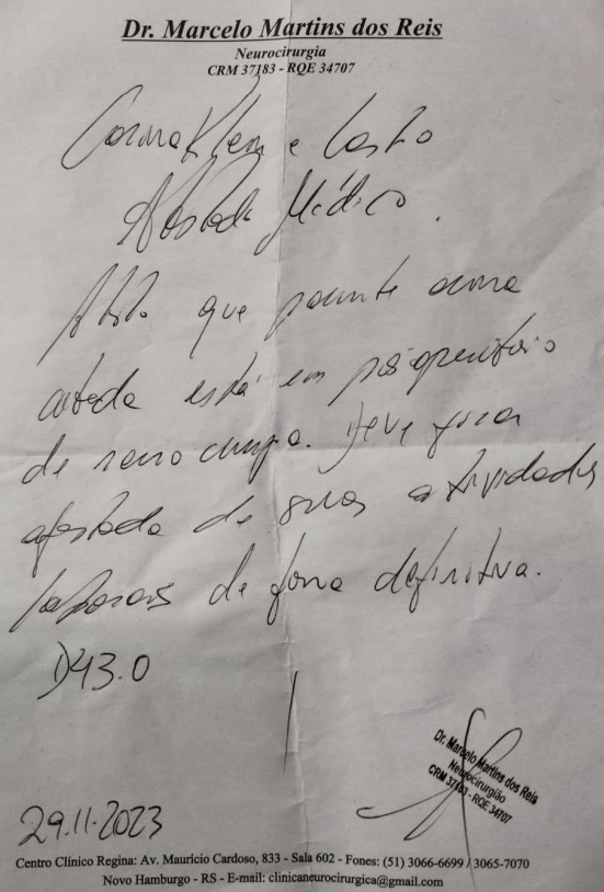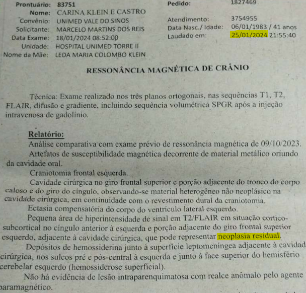 Nesse sentido, o atestado médico datado de 29/11/2023, indicando que a autora necessitava de afastamento de suas atividades laborais de forma definitiva, bem assim o laudo de ressonância magnética de crânio, datado de 25/01/2024, apontando neoplasia residual após a primeira cirurgia.