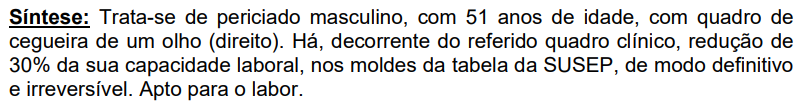 Processado o feito, foi realizada perícia médica, em 16/10/2024, por perito de confiança do Juízo, Dr. Evandro Rocchi (CREMERS 32497), especialista em ortopedia e traumatologia. Em seu laudo (), o expert referiu que o demandante, agricultor, apresenta quadro de cegueira no olho direito (CID-10: H54.4), e concluiu que ele está com sua capacidade laboral reduzida, porém não impedido de exercer sua atividade habitual. Reproduzo trechos do documento: