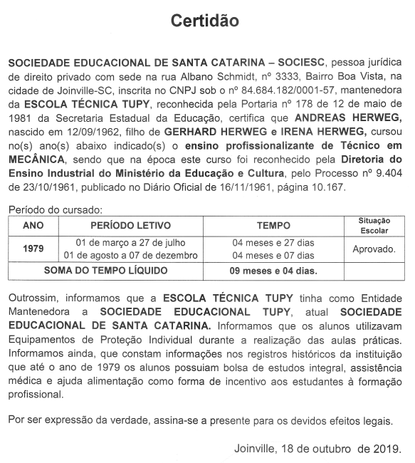 No caso concreto, a certidão expedida pela Sociedade Educacional de Santa Catarina (SOCIESC) descreve a frequência, pela autora, em Escola Técnica Tupy, reconhecida pela Portaria nº 178/1981 da Secretaria Estadual da Educação. No mesmo sentido, a Certidão Escolar da autora, emitida pela Instituição de Ensino, no , fl. 11: