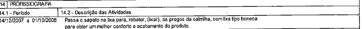 14/12/2007 a 01/10/2008 | Hidrocarbonetos aromáticos (colas, solventes etc.) | - | - | - | não | sim |