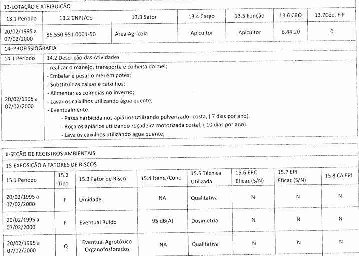 Pelos fundamentos acima delineados não merece provimento o apelo do autor para reconhecer os períodos de 29/04/1995 a 07/02/2000, função de apicultor como tempo especial.