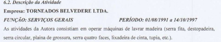 A segurada laborava na empresa Indústria de Torneados Belvedere Ltda. na função de serviços gerais, dentro do setor de produção. Suas atividades eram: