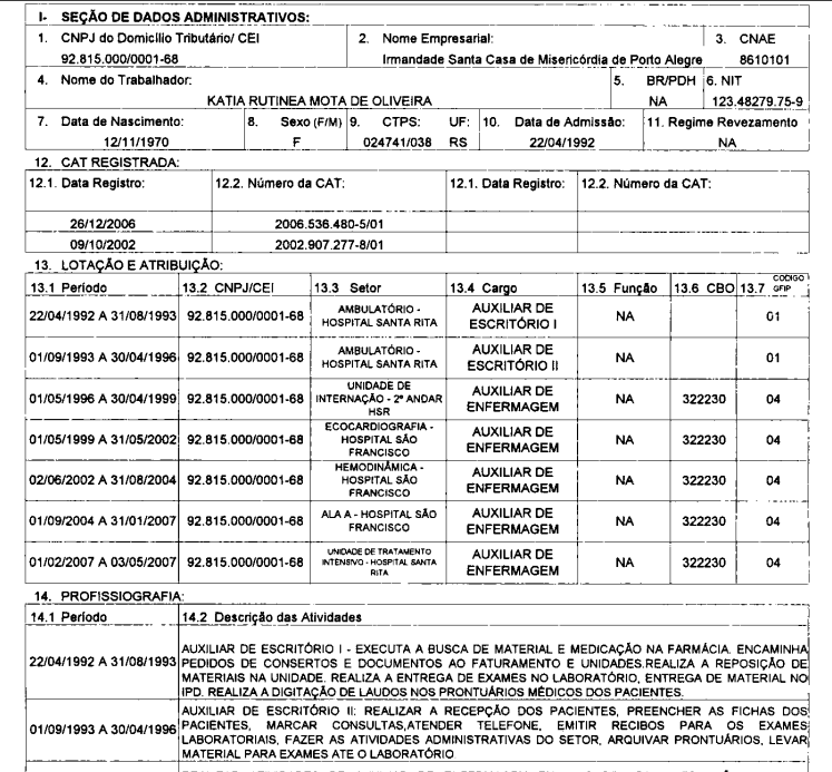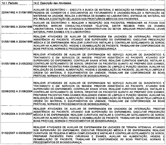 Fica evidenciado, que em todo o período, ainda que dividido em duas descrições, as atividades principais da autora se relacionavam à intermediação entre o público alvo do hospital e o laboratório de exames, inclundo manejo com os materiais necessários para tal fim. O PPP indica, a respeito, a presença de agentes biológicos:
