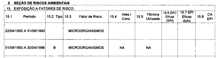 Relativamente ao período de 22/04/1992 a 30/04/1996, com base no cargo desempenhado (de cunho administrativo-burocrático) e na descrição das atividades (tipicamente salubres), é possível se concluir que não havia exposição direta e efetiva a fatores de risco como sangue, curativos, materiais contaminados, roupa de cama utilizada pelos pacientes etc., de modo que, se existia algum risco de contágio por agentes biológicos nocivos (tal como descrito no PPP), este era eventual, desautorizando o enquadramento da especialidade.