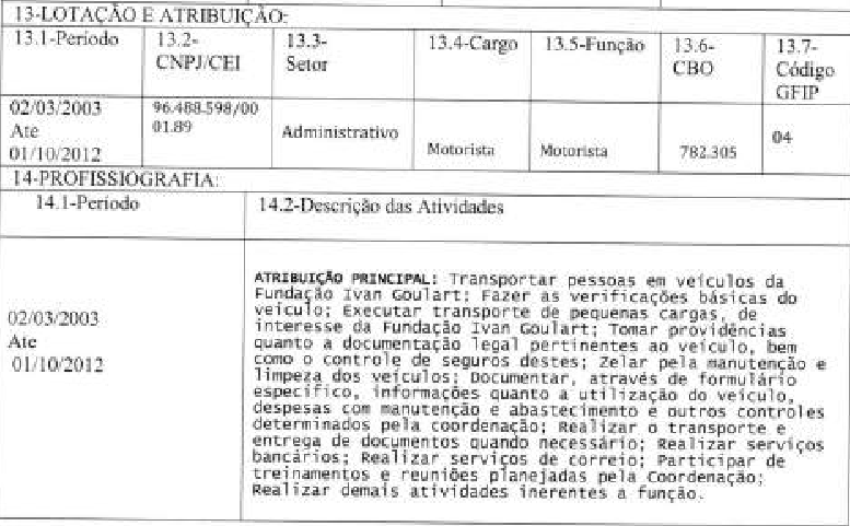 (II) De 02/03/2003 a 01/10/2012, como motorista, para Fundação Ivan Goulart.