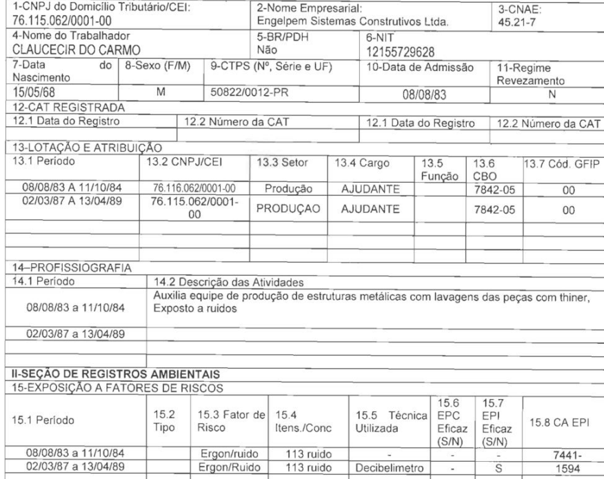 Como se vê, o PPP indica a exposição do autor a agente ruído de 113 dB e a agente químico thinner. A sentença não acerta ao desconsiderar a especialidade da atividade, em razão das informações constantes do laudo LTCAT da empresa, à altura da fl. 26 do , que indica os níveis de ruído com base na medição máxima, nos seguintes termos: