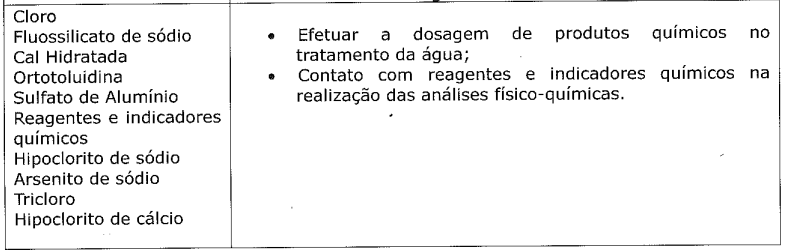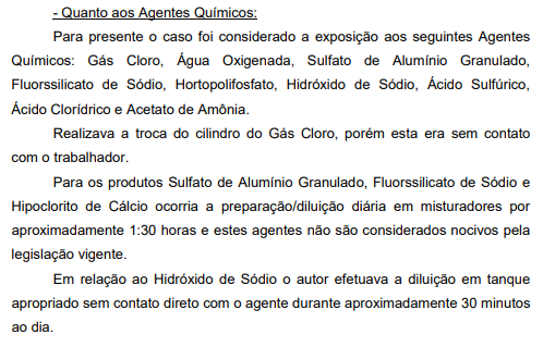 A exposição aos demais agentes químicos (cal hidratada, sulfato de alumínio, permanganato de potássio, etc.) igualmente enseja o reconhecimento do caráter especial da atividade, com base nos códigos 1.2.9 e 1.2.11 do Quadro Anexo do Decreto n. 53.831/64, e 1.2.7 e 1.2.11 do Anexo I do Decreto n. 83.080/79. Nesse sentido: