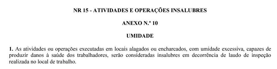 A Norma Regulamentadora 15, aprovada pela Portaria nº 3.214/1978, do Ministério do Trabalho, no Anexo 10, prevê a insalubridade das atividades ou operações executadas em locais alagados ou encharcados, com umidade excessiva, capazes de produzir danos à saúde dos trabalhadores, conforme o laudo de inspeção realizada no local de trabalho.