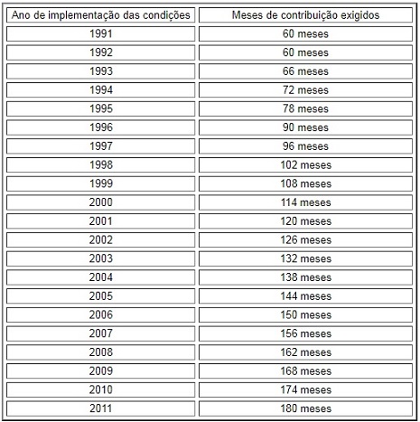 Art. 142. Para o segurado inscrito na Previdência Social Urbana até 24 de julho de 1991, bem como para o trabalhador e o empregador rural cobertos pela Previdência Social Rural, a carência das aposentadorias por idade, por tempo de serviço e especial obedecerá à seguinte tabela, levando-se em conta o ano em que o segurado implementou todas as condições necessárias à obtenção do benefício: (Artigo e tabela com a redação dada pela Lei nº 9.032, de 28.4.95)