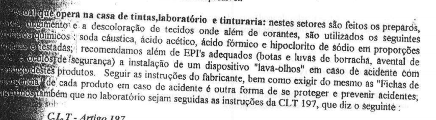 Indica ainda, a presença de agentes químicos sem especificar. O Laudo apresentado () esclarece, contudo, que na função e atividades desenvolvidas pelo Autor ele estava exposto aos agentes; soda cáustica, ácido acético e ácido fórmico.