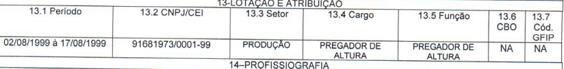 Relativamente ao período de 02/08/1999 a 17/08/1999, em que atuou na empresa Zenglein & Cia Ltda, consta PPP () que indica que o autor trabalhou como pregador de altura, no setor de produção: