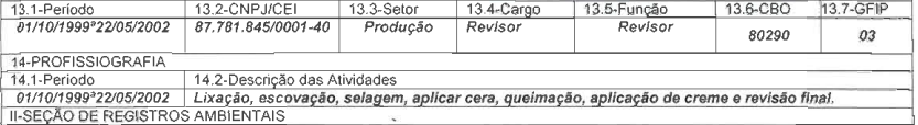 Quanto ao período de 01/10/1999 a 22/05/2002, trabalhado na empresa Sace Indústria, Comércio, Madeira e Termoplástico Ltda, consta PPP () nos autos que indica a seguinte profissiografia: