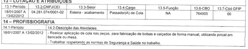 Conclusão: O formulário não serve para avaliar as condições de trabalho do Autor, porquanto firmado por dirigente sindical. Tampouco há nos autos laudo emitido pelo empregador. A anotação na CTPS é contemporânea ao período em que a atividade foi desenvolvida e contém a indicação de que a Parte Autora trabalhava na função de passador de sola. Diante disso, e considerando que a empresa está inativa, cumpre verificar a viabilidade da aplicação de laudo similar, como requerido na inicial. Pois bem. O Autor acostou aos autos laudo similar elaborado na empresa Bom Cal Beneficiadora de Calçados Ltda, o qual indica que o segurado que trabalha como passador de sola em indústria calçadista está sujeito a ruído excessivo, superior a 90dB e hidrocarbonetos aromáticos. Portanto, está comprovada a especialidade do período. |