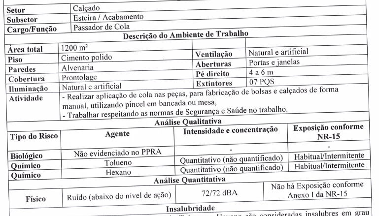 É fato notório que, nas empresas do ramo calçadista, os operários são contratados como serviços gerais, ajudante, auxiliar, atendente, entre outros, mas que a atividade efetiva consiste no trabalho manual do calçado, em suas várias etapas industriais. É sabido, também, que a indústria calçadista sempre depende da cola para a industrialização dos seus produtos. A cola utilizada em época remota era composta por derivados de hidrocarbonetos, cujos vapores acarretavam graves efeitos na saúde do trabalhador.
