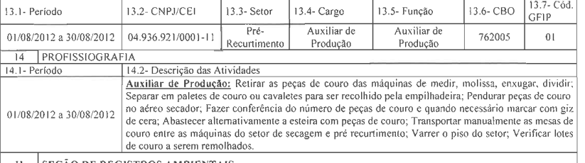 Quanto ao período de 01/08/2012 a 30/08/2012, em que atuou na empresa AMCM Indústria Comércio Importação Exportação e Serviços Técnicos Ltda, consta PPP () nos autos, que indica a seguinte profissiografia para a função de auxiliar de produção, do setor de pré-recurtimento: