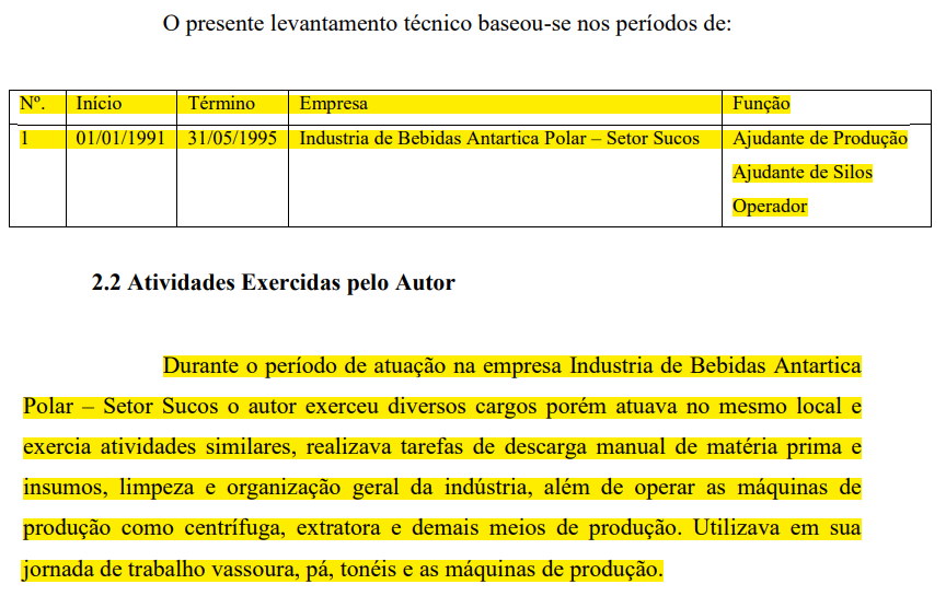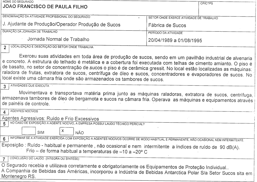 Relativamente ao mesmo período, o Laudo juntado por similaridade, concluiu que "o autor esteve exposto a ruído em LAVG de 90 - 98dB(A), oriundo das máquinas e motores em ambiente fechado, considerada a exposição habitual ao agente". Note-se, a partir da anotação constante do item "7" do PPP ("A Companhia de Bebidas das Américas, incorporou a Indústria de Bebidas Antarctica Polar S/a Setor Sucos sita em Montenegro RS") que referido laudo decorre de perícia judicial que foi feita na mesma empresa em que laborou o autor e referente a mesmo período ( p.3):