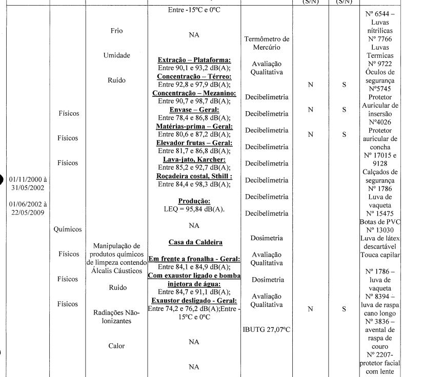Agente Nocivo: | Ruído superior a 85,00 dB - artigo 2º do Decreto 4.882/2003, que alterou o Código 2.0.1 do Decreto 3.048/99. Frio inferior a 12 °C - Código 1.1.2 do Quadro Anexo do Decreto 53.831/64. |